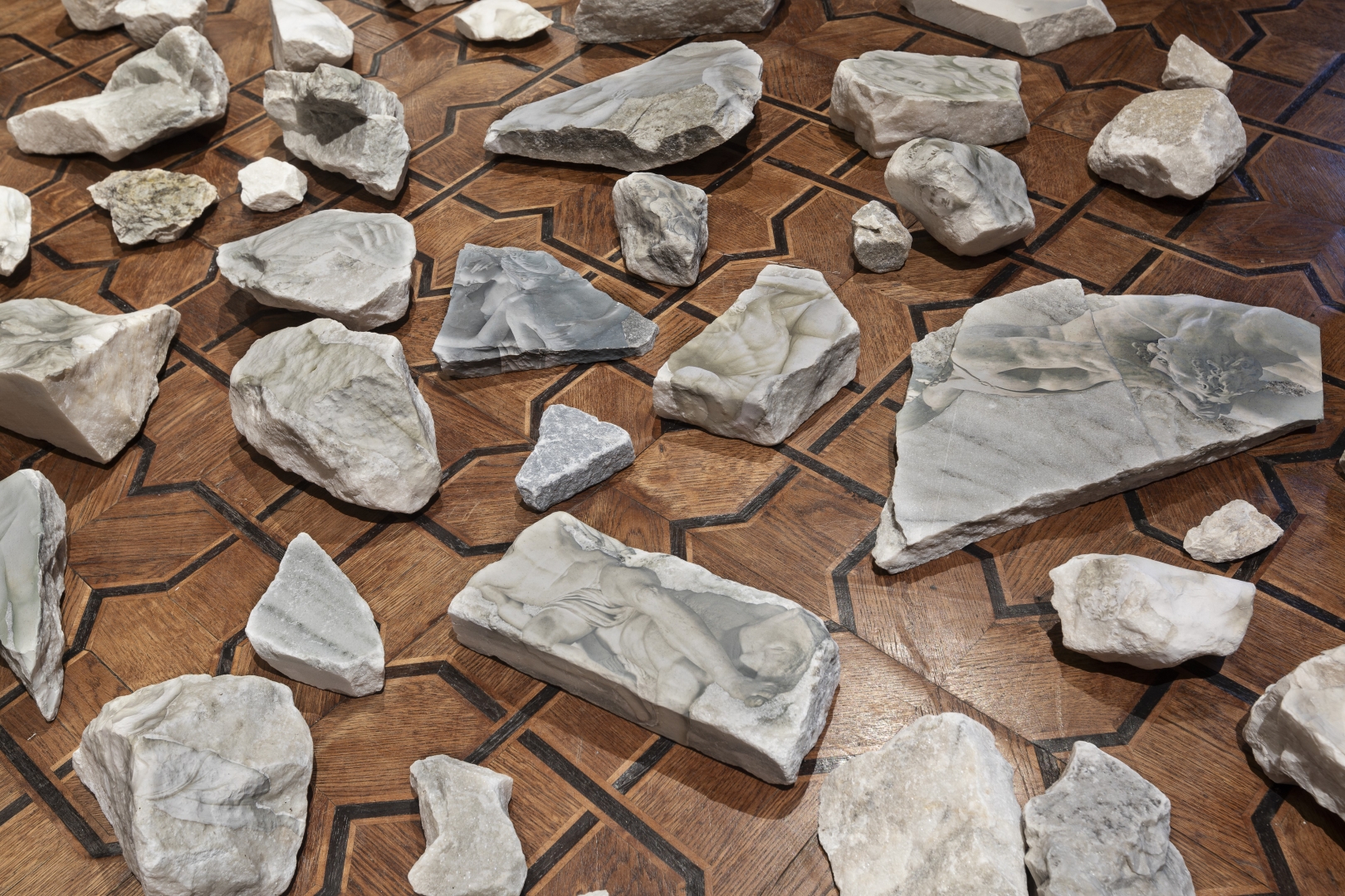 Instalacja Marmury (2018/2024) jest kontrapunktem dla Statues Also Fall in Love. W ramach tego projektu Rosenberg zbierała marmurowe odłamki w kamieniołomie w Vermont, a następnie naklejała na nie fotografie klasycznych rzeźb – kolaże dokładnie pasujące do konturów fragmentów marmuru, tworząc efekt trompe l’œil, który – jak mówi artystka – „zwodził widza, że oto widzi prawdziwe ruiny”.