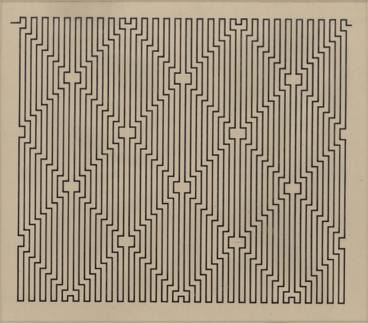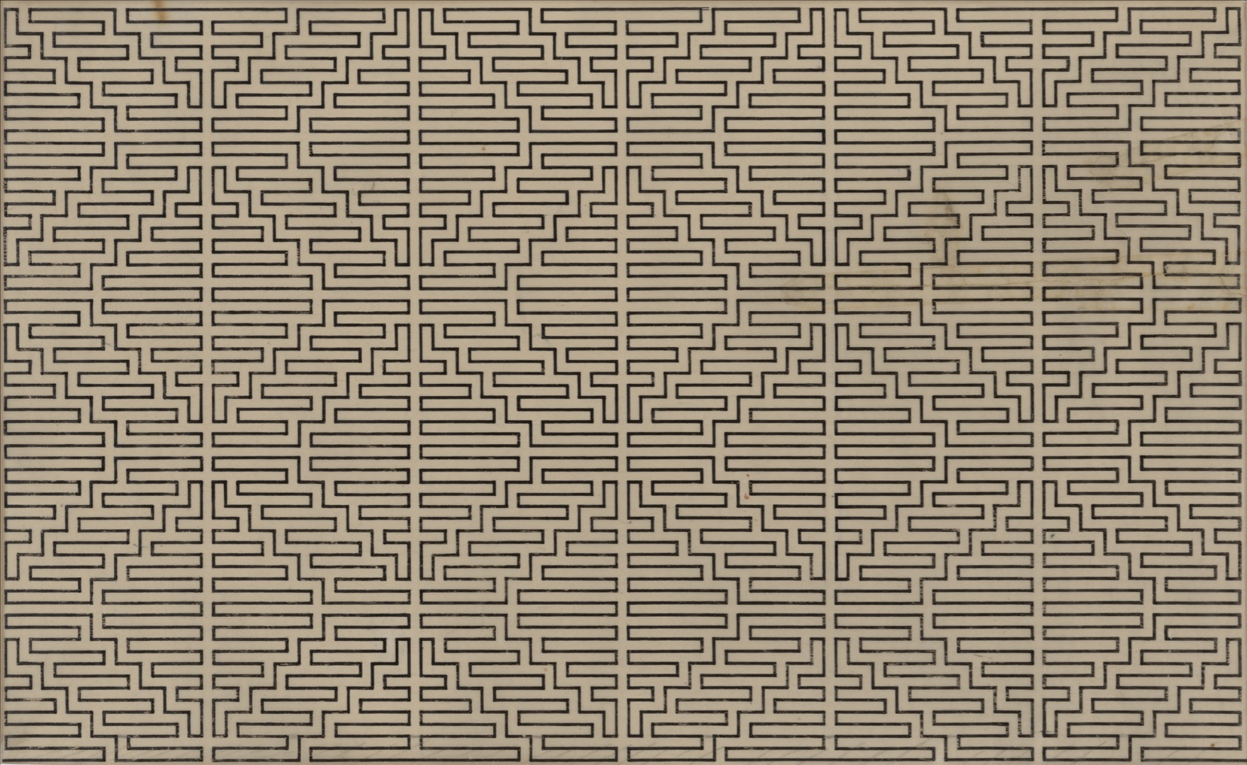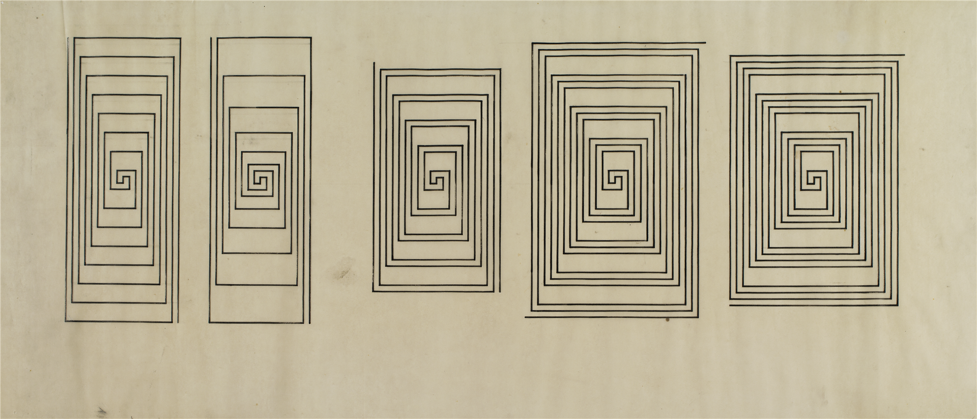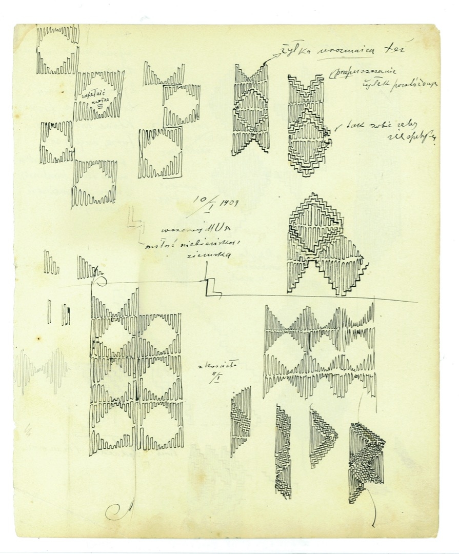 Wacław Szpakowski was born in Warsaw, Poland. His family moved to Riga in 1897, and he began studying architecture at the city’s Technical University in 1902. He developed a keen extracurricular interest in meteorology and studied atmospheric phenomena such as hurricanes, cyclones and storms, writing down facts and observations in his notebooks. Riga is also where he produced his oeuvre of maze-like drawings, each consisting of a single continuous line, which he would later explain in a treatise called Rhythmical Lines (1969). In 1911, soon after completing his studies, he moved back to Poland and began working as an architect and building engineer while continuing to make drawings in his spare time. Szpakowski’s work was not shown publicly until 1978, when a first exhibition was held at Muzeum Sztuki in Łódź.
