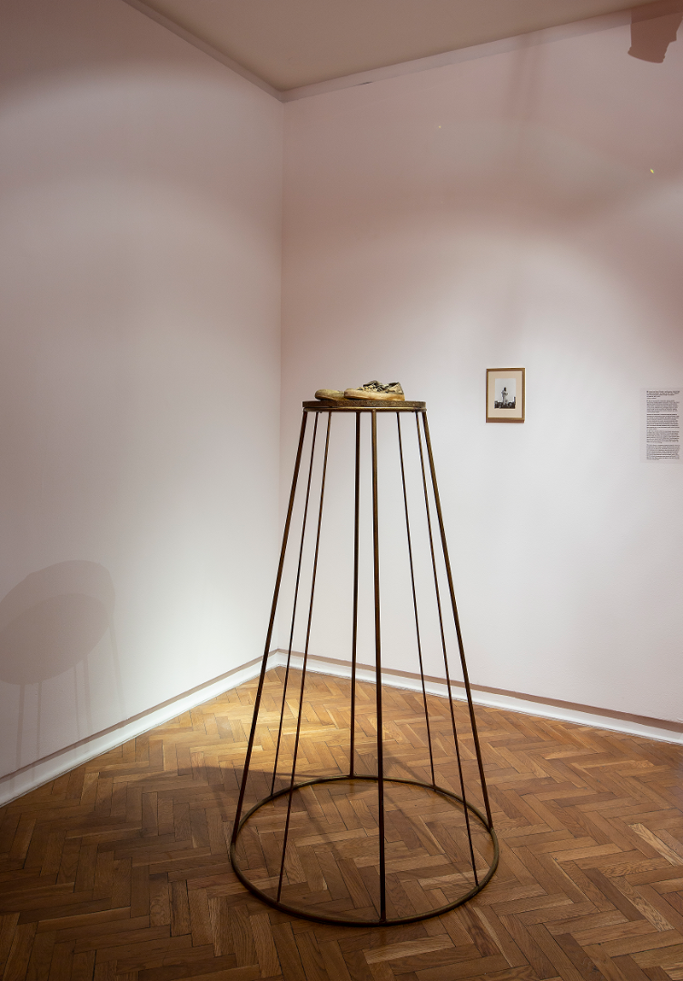 The first theme of the exhibition concerns museums. Artists working with art institutions constantly reflect on the function of those institutions and artists’ presence in them. The worn-out golden-painted sneakers on a tall metal plinth is an installation documenting a performance by James Lee Byars during Documenta 5 in 1972, which indicates, inter alia, the process of creating meaning around artistic gestures. The counterpoint here is a film by Assaf Gruber about a person for whom taking care of art and its presentation has become the very reason of existence and the main element of everyday activities. Jasmina Cibic's photos remind us that museums are the time capsules in which we store unusual and poetic objects. The artist photographed the reverse of the paintings by Sophie Taeuber-Arp and Władysław Strzemiński with numerous stickers documenting the history of these objects, on which we see butterflies whose life by Nature's plan is short.