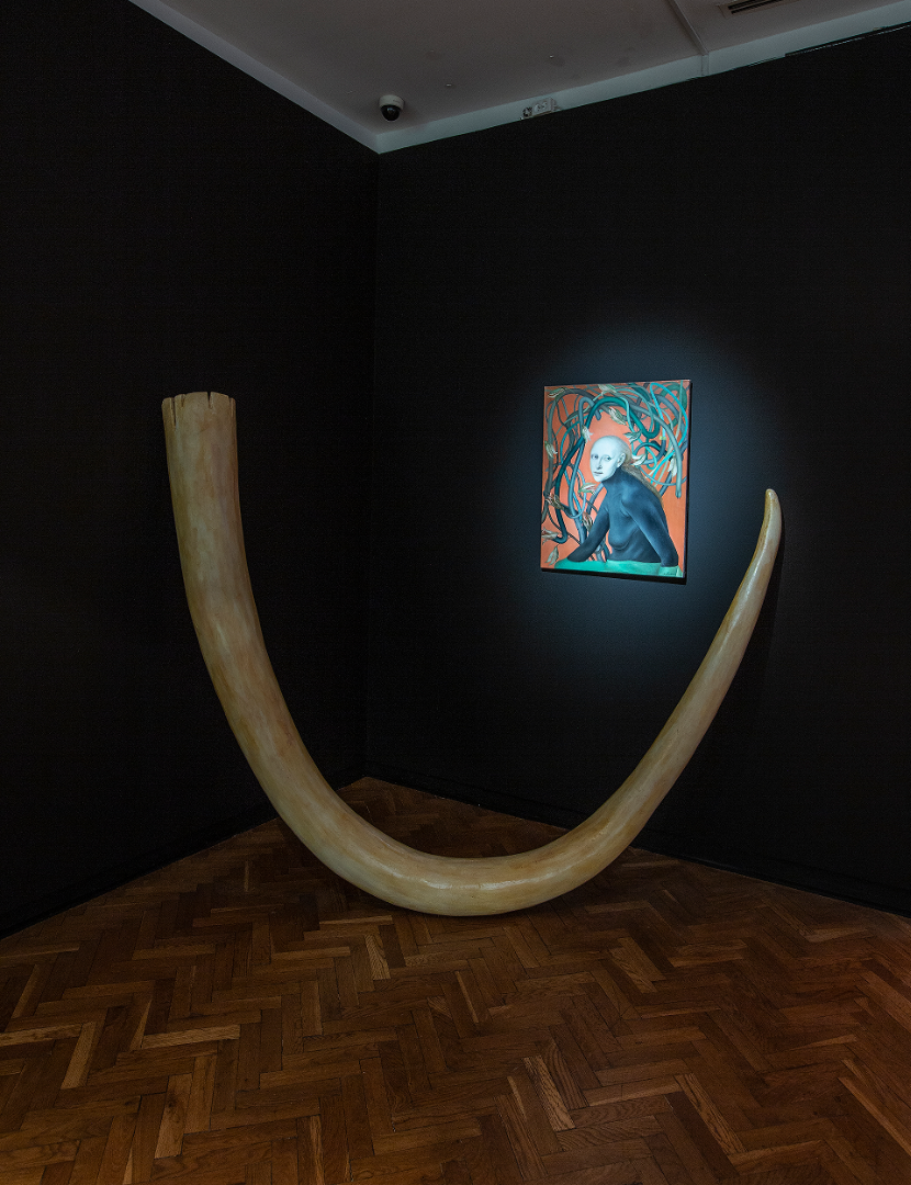The second theme of the exhibition, indicated by the literal reading of the title, is a divagation on the beauty of distant worlds, which gives an impulse to get to know them. It refers to the relationship between museums and cabinets of curiosities. The wing of an exotic bird in Zbigniew Rogalski's work refers to the dream of distant lands, to flying, but also to this bird’s death. Joanna Malinowska in the sculpture Mammoth Tusk, made mainly of polystyrene, asks a question about the imitative possibilities of art and the ancient principle of mimesis. A museum may also be a place where differences and strangeness are negotiated. Wiktor Gutt and Waldemar Raniszewski painted the faces of people participating in the Rockowisko rock music festival in Łódź in 1981 with unique patterns. The photos documenting this artistic action show the collective desire for otherness, as well as the individualism of contemporary people at a specific historical moment. While Gutt and Raniszewski engaged in capturing the uniqueness of their interlocutors, in the film by Zbynĕk Baladrán we come across a story about the impossibility of engaging in dialogue. The artist, in a distant reference to Stanisław Lem's novel Eden, focuses on procedures created in a neutral language, leading to the shooting of a creature that entered an oil rig on a distant planet. The story unrolls with conjectural competition for resources taking place at its background. The question of how many conditions must be met in order for the Other to be an enemy has been asked in an extremely subtle way in this work. The protagonists of the film abandon the attempt to understand the Other in favour of conquest.